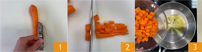 To prepare the cold pasta with roasted carrot cream, first, trim and peel the carrots 1, then roughly chop them into cubes 2. In a skillet, heat a drizzle of oil, then add the carrots 3 and roast them on low heat for about 10 minutes.