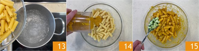 Cook the pasta in boiling salted water 13. Drain it into a bowl, add the carrot cream 14, and mix. Also, add the cucumbers 15, keeping some aside for plating.