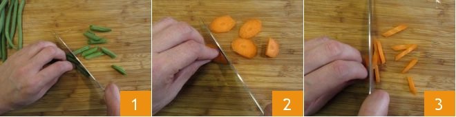To make cold pasta with vegetables and turmeric, first wash the green beans, trim them, and cut them in half 1. Peel the carrots and slice them diagonally 2 then cut the slices into small sticks 3.