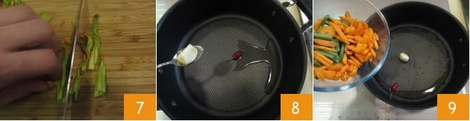 And cut the petals into strips 7. Place a pot full of water on the stove to bring to a boil (this will be for cooking the pasta). Heat the olive oil in a large pan, add the whole chili pepper and the garlic clove 8. Sauté for 5 minutes, then add the carrots and green beans 9 and stir-fry over medium heat for 5 minutes.