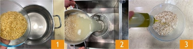 To prepare cold rice with tuna, zucchini, and lemon, first cook the rice in boiling water, salted to taste, for 12 minutes (or as indicated on the package) 1. Once cooked, drain the rice 2, place it in a bowl, season with extra virgin olive oil 3, mix, and let it cool.