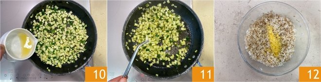 Deglaze the zucchini with the lemon juice 10 and continue cooking for another 2-3 minutes, then let them cool 11. Now, add fragrance to the rice with the lemon zest 12.