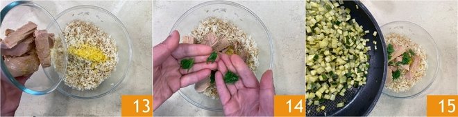 Add the drained tuna 13, mint leaves 14, and zucchini 15.