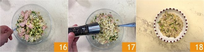 Mix 16 and adjust with salt and pepper 17. The cold rice with tuna, zucchini, and lemon is ready to enjoy 18!