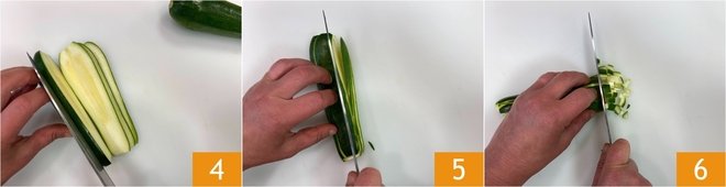 Proceed to the zucchini: wash them, trim them, and cut them in half lengthwise. First, cut them into slices 4, then into strips about 3/8 inch wide 5, and finally into cubes 6.