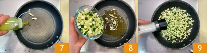 Heat a drizzle of oil in a pan with 2 cloves of garlic 7, let it sauté for a minute and add the zucchini 8. Season with salt 9 and pepper. Let it cook for a couple of minutes, and in the meantime, squeeze the lemon to extract the juice.