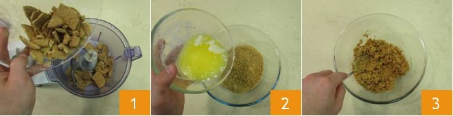 To prepare the cold watermelon jelly cake, start by lining the base of a 9-inch mold with parchment paper, both at the base and around the circumference. Melt the butter in the microwave or on the stove, and in the meantime, pour the cookies into the mixer 1. Activate the blades to obtain a sandy mixture, transfer it to a bowl, and pour the butter 2. Stir with the spoon 3