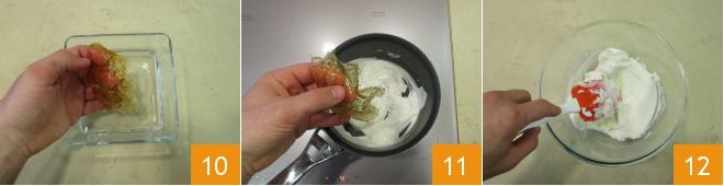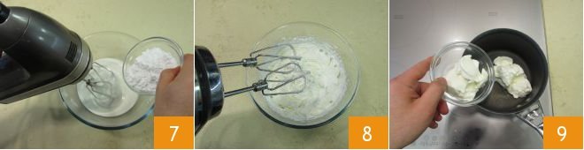 Then pour the cream into a bowl and operate the whisk at medium-high speed while pouring the sugar in little by little 7. Gradually increase the speed and whip until almost stiff; set aside 8. Heat the yogurt in a saucepan, without bringing it to a boil 9.