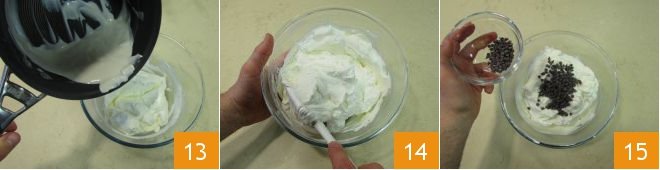 Combine the yogurt with the dissolved gelatin 13, mix, and then gently fold in the cream 14. Finally, add the chocolate chips, keeping a handful aside for decoration 15.