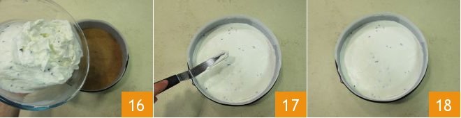 Transfer the cream into the mold 16, level to obtain a smooth surface 17, and let it set in the fridge for at least 1 hour 18.