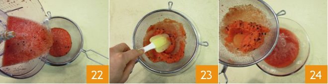 Filter everything through a sieve placed over a bowl 22 and sift carefully 23 to discard unfiltered pulp and seeds 24. You should obtain 2 cups of juice.