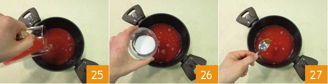 Pour the juice into a saucepan 25 and add the sugar 26, cinnamon 27