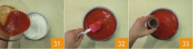 As soon as it is at room temperature, the first hour of the cake's setting should have passed, pour the watermelon jelly over the surface 31. Level 32 and garnish with the remaining chocolate chips, put it back in the fridge for at least another 3 hours 33.