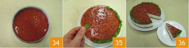 After the time has passed, detach the mold and the parchment paper 34, place the cake on the serving plate, and garnish the circumference by overlapping mint leaves, they will resemble the fruit's rind 35. Here is your cold watermelon jelly cake, serve it very cold 36!