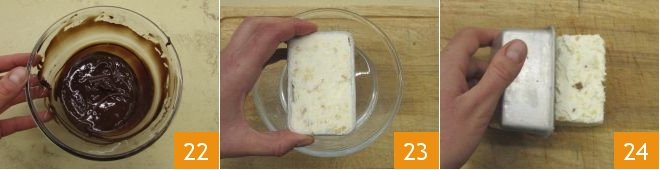 Until it becomes fluid 22. Unmold the semifreddos by dipping the base of the mold in hot water 23 and running a small knife between the semifreddo and the mold. Turn out onto a cutting board 24.