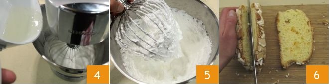 Once the syrup reaches 250°F, lower the mixer speed and slowly pour half of the syrup over the egg whites 4, then increase the speed again. Continue to slowly add all of the syrup and mix until the meringue is completely cool. Stop the mixer when the meringue is very dense, smooth, and glossy 5. You will obtain about 4.6 oz of meringue. Cut 5.3 oz of colomba 6