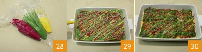 Pour the leftover colorful béchamel into piping bags 28 and create colorful decorative patterns 29. You can bake the colorful lasagna in a preheated static oven at 356°F for 40 minutes (or in a fan oven at 320°F for 30 minutes). Take the colorful lasagna out of the oven 30 and serve hot!