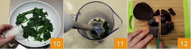 Gradually add the previously warmed milk 7, and continue stirring to thicken the mixture over low heat; you can flavor with grated nutmeg and add a pinch of salt. When the béchamel has reached a creamy consistency, turn off the heat and divide it into three small bowls 8 (cover them with plastic wrap in contact with the surface to prevent a skin from forming). In a separate pan, pour a little oil and the crushed garlic, then cook the previously washed spinach 9.