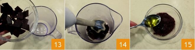 and blend them (13-14), then season with a teaspoon of oil 15 and salt to taste.