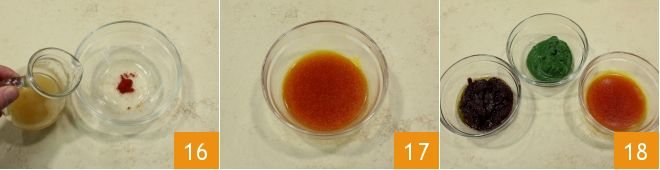 Season the bowls of béchamel with the different creams, spinach 19, beetroot 20, and saffron, so as to have three béchamels of different colors and flavors 21.