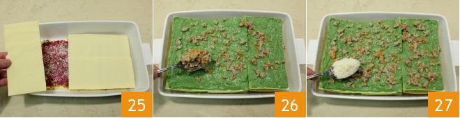 Continue with another layer of pasta 25, then alternate the layers with ragù, Parmesan, the other two colorful creams, and thyme until you run out of ingredients (you can finish with the spinach béchamel). Then spread the remaining ragù 26 and sprinkle with Parmesan 27.