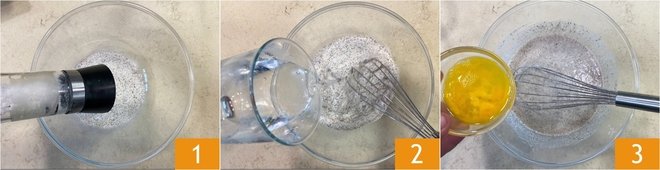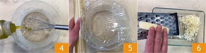 Finally, add the oil 4 and mix again. Cover the bowl with plastic wrap 5 and let it rest in the refrigerator for at least 30 minutes. Meanwhile, grate the Gruyere cheese using a coarse grater 6.