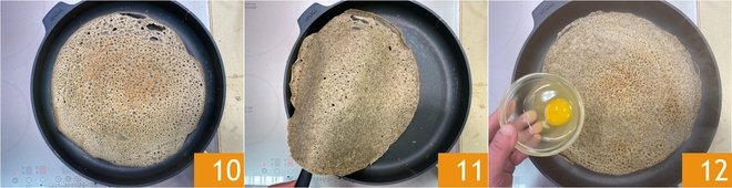 When the edges start to lift 10, gently flip it with a spatula 11, then pour an egg into the center 12.