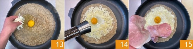 Distribute the grated cheese around the egg, leaving the outer edge free; the melted cheese will help the egg stay in place 13. Salt and pepper the egg 14 and continue to cook for another 2-3 minutes, until the egg white is cooked. At this point, place about 2.3 oz of sliced cooked ham around the egg 15.