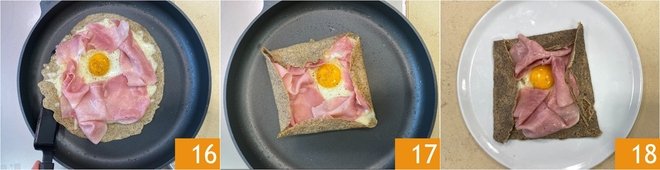 Lift the edges of the crepe with a spatula and fold them inward 16 to form a kind of square with the filling still visible 17. Proceed in the same way to make the other 3. Serve your complete Breton galette garnished with marjoram leaves 18!