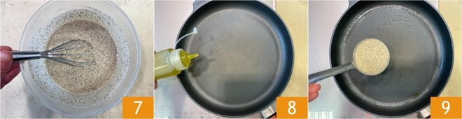 After the resting time, give the batter another stir to soften it 7, then grease a non-stick pan with a base diameter of 12 inches with a bit of oil 8. Place it on the heat, and when it's hot, pour a generous ladleful of batter into the center 9. Rotate the pan to spread it evenly and cook for about 2 minutes over medium-low heat.