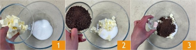 To make the dark chocolate and Himalayan pink salt cookies, pour the sugar and softened butter into a bowl 1, then add the finely chopped dark chocolate 2 and pink salt 3.