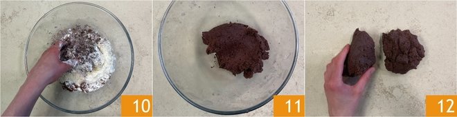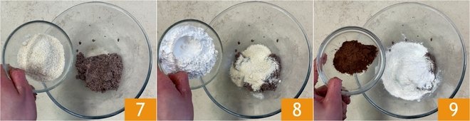When you have formed a dough, add the almond flour 7, all-purpose flour 8, and cocoa powder 9.