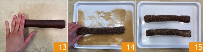 Form 2 rolls with a diameter of about 1.6 inches 13, then roll them in brown sugar to cover them completely 14. Place the rolls on a tray and let them firm up in the fridge for 2 hours 15.