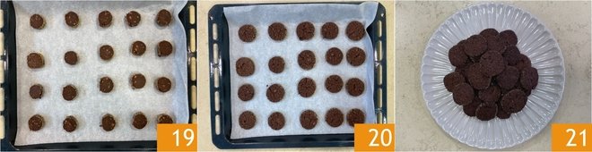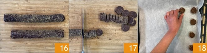 After the firming time 16, cut the rolls into discs about 0.2 inches thick 17. Place the discs on a baking sheet lined with parchment paper, spacing them apart 18.