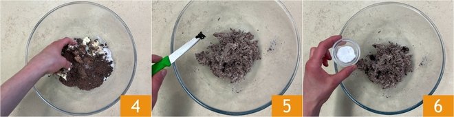 Mix the ingredients with your hands 4, then add the vanilla seeds 5 and baking soda 6. Continue working the mixture until you get a homogeneous consistency.