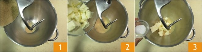Add the zest of half a lemon 4 and work the ingredients with the hook. After a couple of minutes, add the cold egg yolks 5 and continue to work the mixture for another couple of minutes. Add the all-purpose flour 6