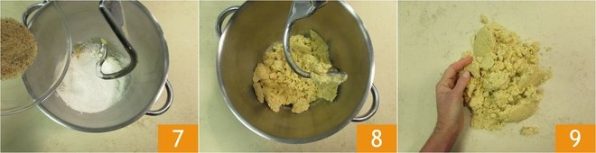 and the hazelnut flour 7. Knead until you obtain a uniform and compact dough 8. Transfer to a work surface, quickly knead the dough by hand 9 to form a dough ball.