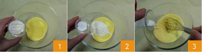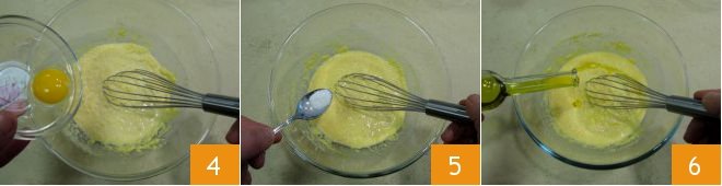 Separate the yolk from the egg white and add the yolk to the batter 4. Stir and add the salt 5 and oil 6, mixing to incorporate all the ingredients.