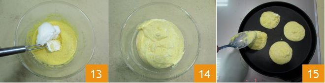 Take the rested batter and gently fold in the whipped egg whites a little at a time 13. Once the batter is ready 14, cook the blinis: heat and lightly oil a flat pan (you can use a paper towel to spread the oil over the surface). Pour a few spoonfuls of batter to create disks about 2.5 inches in diameter 15 and cook over medium-low heat.