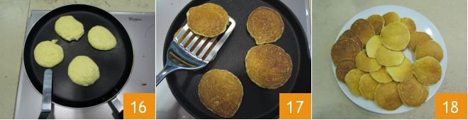 Once the base is golden, gently flip them 16 to cook the other side as well 17. Continue this way with all of them, and once cooked, place them on a serving plate 18. With these quantities, you will get about 20 blinis.