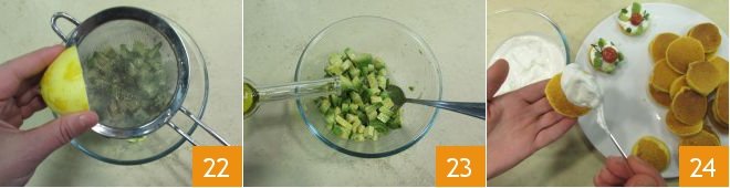 Pour into a bowl and squeeze the juice of a lemon, filtering it with a strainer 22; this will prevent the avocado flesh from oxidizing. Season with a drizzle of oil 23 and white pepper to taste. You can decorate each corn blini with a spoonful of skyr 24,