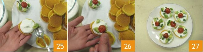 diced avocado 25 and roasted cherry tomatoes 26. Your corn blinis with skyr, avocado, and roasted cherry tomatoes are ready to be served 27.