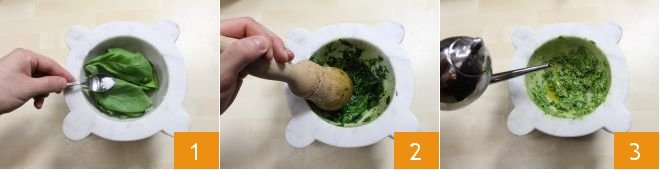 To prepare the couscous flan with pesto and taleggio sauce, you can start with the Genoese pesto: place the basil in the mortar 1, pound it well with the other ingredients 2, and finally pour in the extra virgin olive oil 3. If you want to go deeper into the process, then read the complete Genoese pesto (Pesto alla genovese).