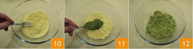 After the time has passed, fluff the couscous with a fork 10, add the pesto 11, and continue to mix to absorb the seasoning well 12.