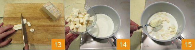 Meanwhile, prepare the taleggio sauce, cut the cheese into pieces 13, and place it in a pan with the milk 14, add the grated Parmesan 15.