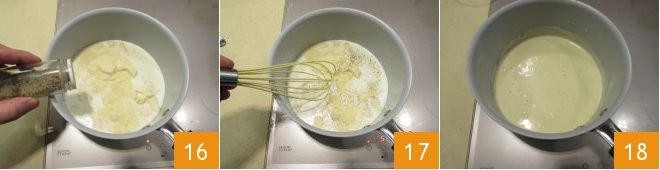 and the ground black pepper 16 and mix with a whisk 17 at medium temperature, being very careful not to form lumps 18.