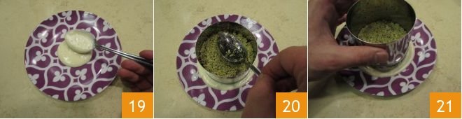 Pour the taleggio sauce in a radial pattern, like a mirror, on the plate 19, then place a pastry ring and fill it with couscous, leveling it with a spoon 20, let it sit for a moment to settle, then gently remove the mold 21 and serve the couscous flan with pesto and taleggio sauce. Garnish as desired with pine nuts and basil.