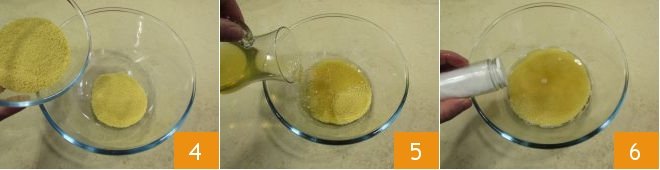 Prepare the couscous by pouring it into a container 4, cover it with hot vegetable broth 5, and add the salt 6.