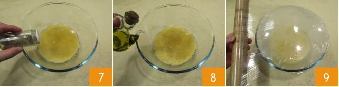 the pepper 7 and the extra virgin olive oil 8 and after mixing everything well, cover with plastic wrap 9, following the cooking instructions for the couscous on the package; ours is ready in 6 minutes.