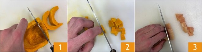 To prepare the couscous with chickpeas, chicken, and pumpkin, first prepare the Vegetable broth and keep it warm. Peel the pumpkin and remove the seeds. Cut 300 g (10.6 oz) of flesh first into slices 1 and then into cubes 2. Also, cut the chicken into cubes of about 2 cm (0.8 inches).